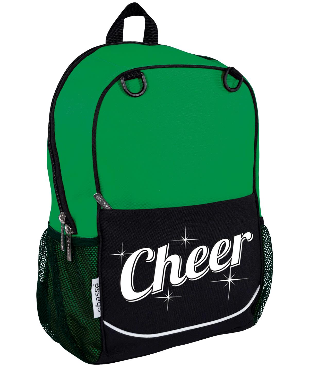 Lightweight with padded back panel and shoulder straps. Exterior front pocket and two side mesh pockets. Two exterior rings for decorative attachments. Double zip main opening with one interior zip-close pocket. Includes "CHEER" screen-print. Size: 17" x 5" x 12".