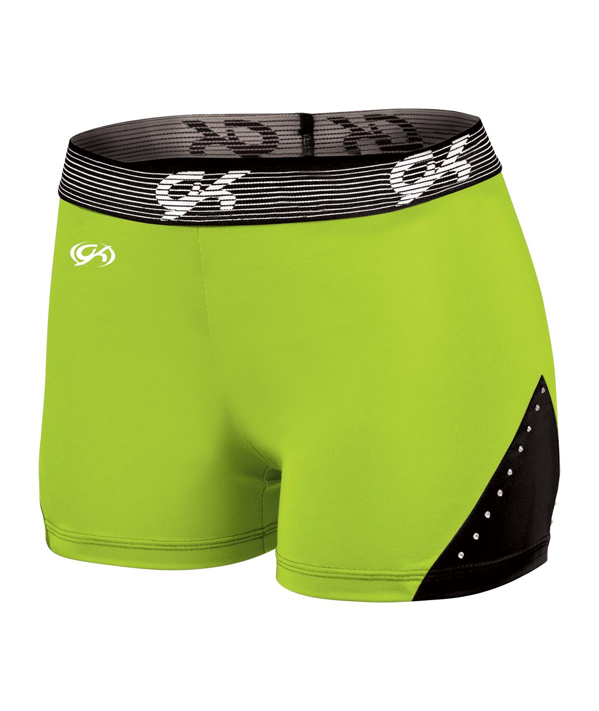 The GK Elite Radiate Short (185GSH) was created for the bold cheerleader. With its revolutionary black contrasting panels, clear gems and elastic bands along the upper back these cheerleading shorts offer every element that a cheerleader needs. These shorts come in five trend-worthy colors including Neon Green and Turquoise and are available in child sizes small though large and adult sizes small through double extra-large.