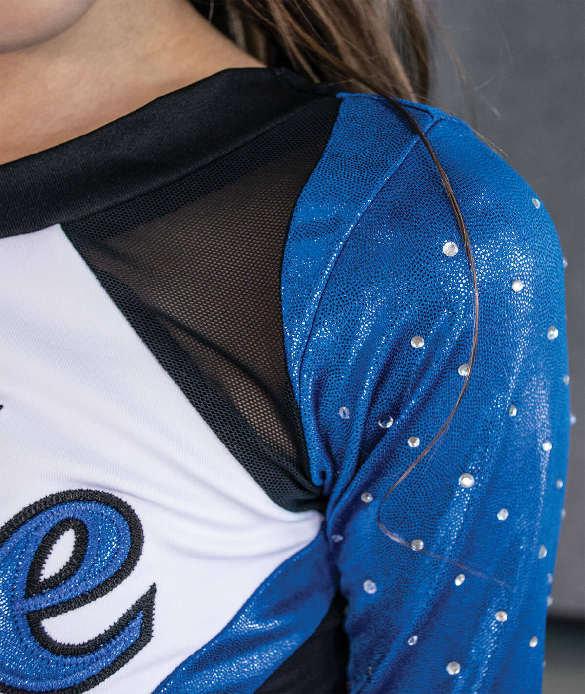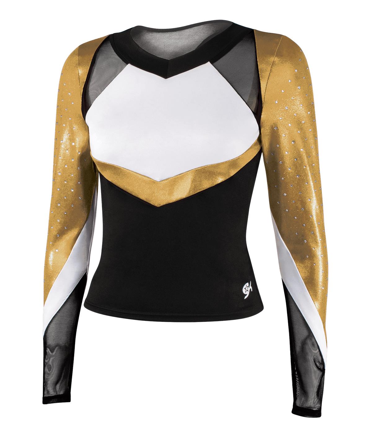 The GK All Star Invincible Top (190GLS) will instantly put you into the world of your competition. This fitted pull-on top has enough stretch and flexibility to get you through your routine while showing you off with mesh, metallic and rhinestone detailing. The back features a racerback cutout for added style. Embellish the cheer uniform with stones for an added flair!