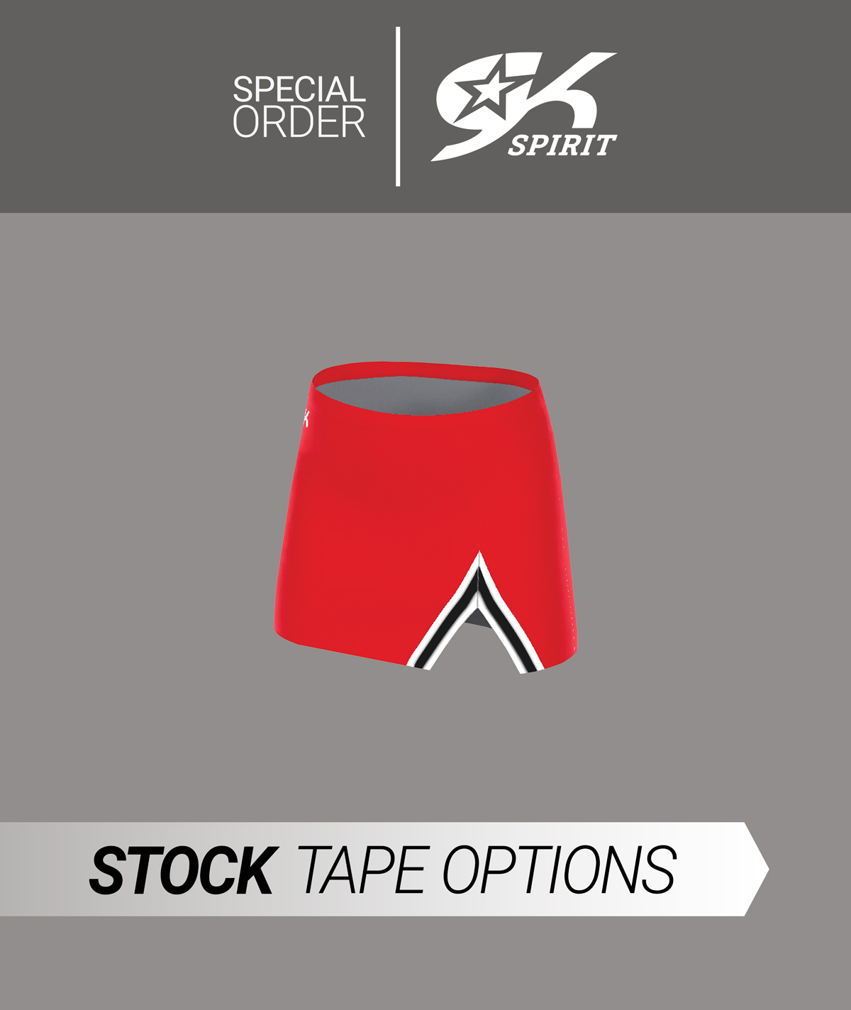 The GK Spirit Solid V-Notch Skirt with Tape (GS417K) offers a timeless design with a modern twist, perfect for creating a standout cheer look. Featuring custom notch tape trim detail, this made-to-order uniform skirt gives you full control over your team?s style. Simply click customize to choose your taping and color options, creating a unique look that reflects your team?s personality.