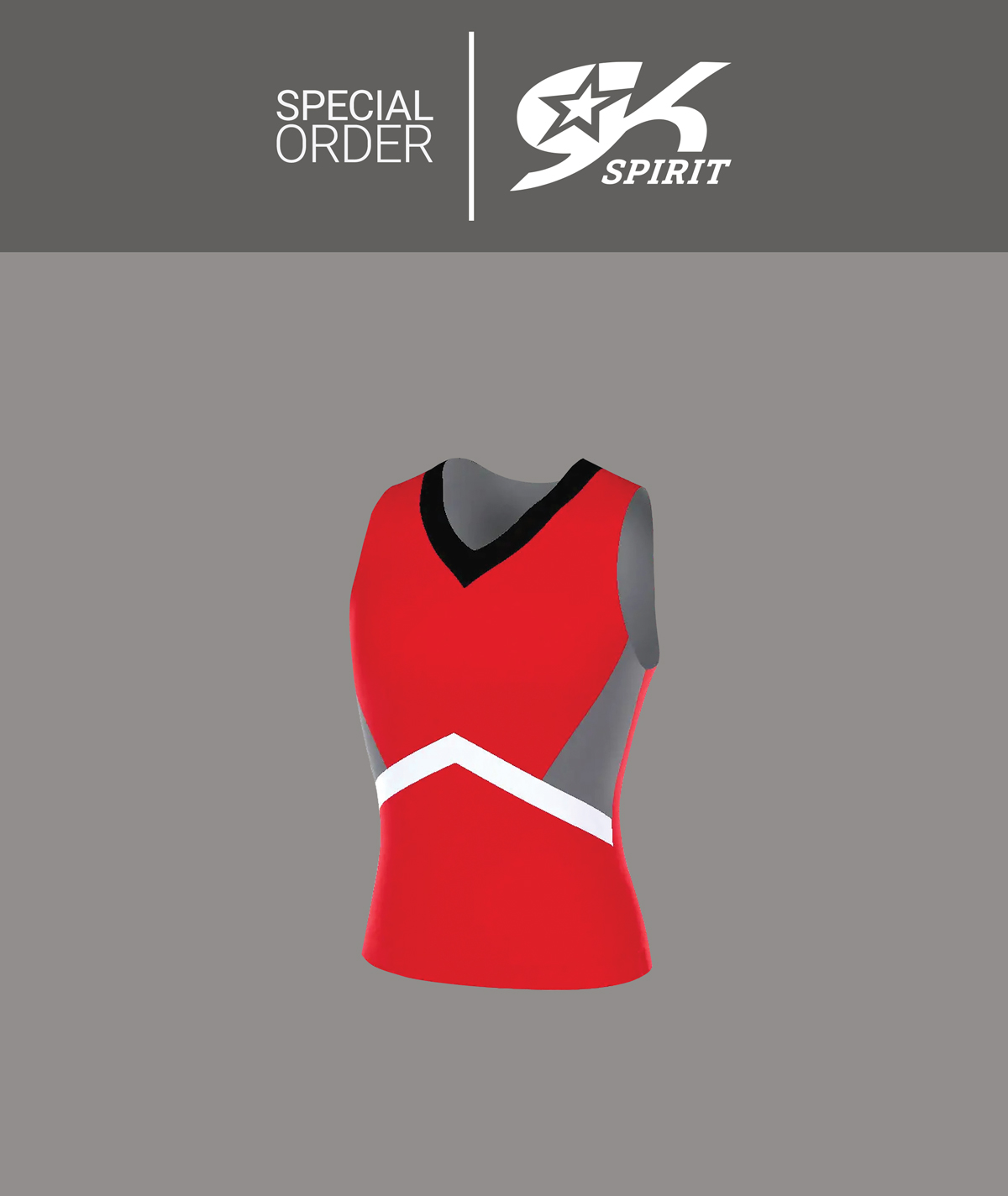 The GK Spirit V-Neck Side Panel Chevron Shell Top (GS422S) is a top-selling special order favorite, perfect for creating a personalized cheer uniform that stands out. Designed with customizable front and side panels, this made-to-order top is the ultimate choice for teams that want their look to stand out. The front chest panel offers the perfect space for your team's logo or lettering, while striking chevron bodice details add a bold touch. Wear it alone for a sleek, modern look, or layer it with a matching bodyliner for added warmth and versatility.