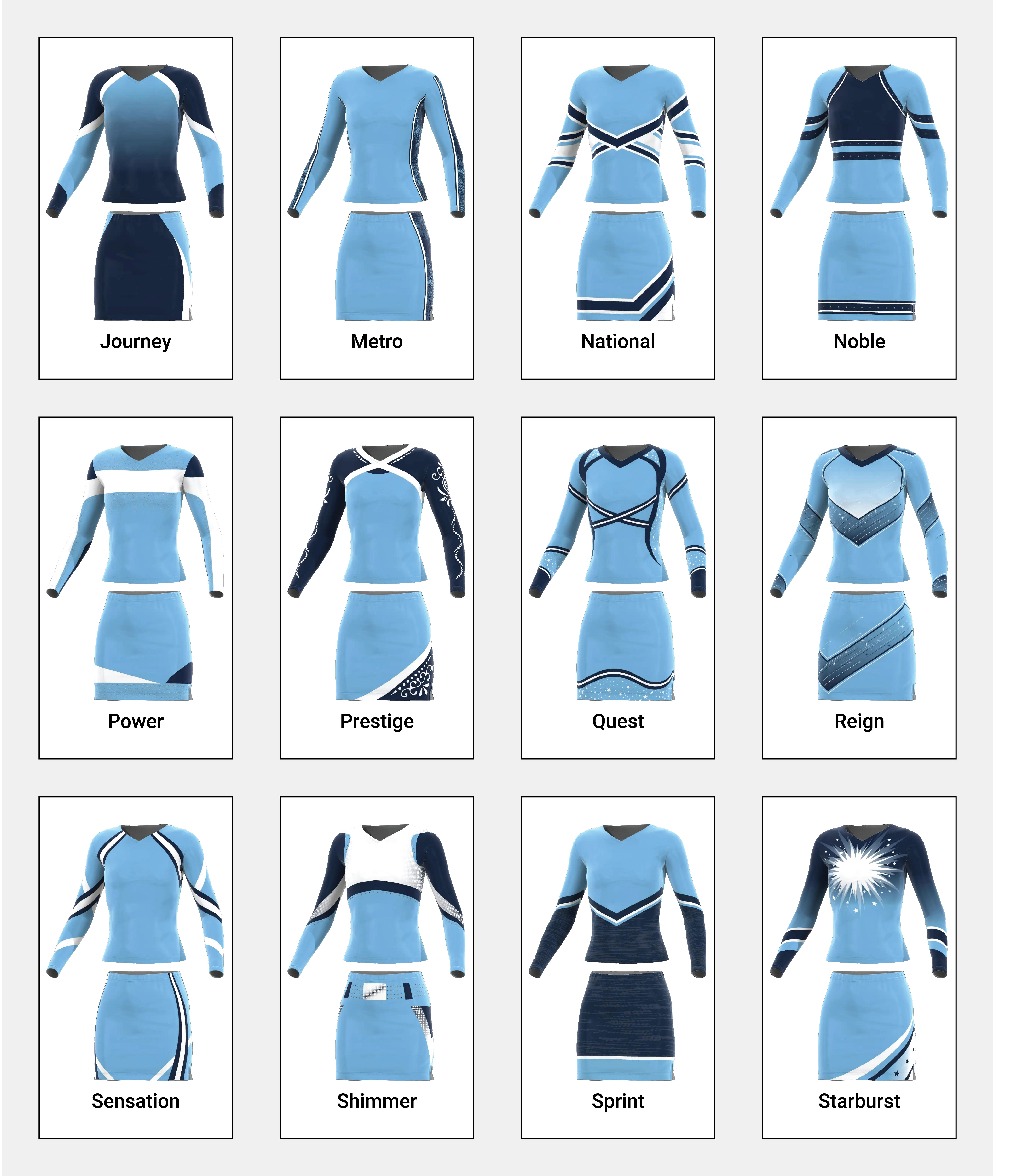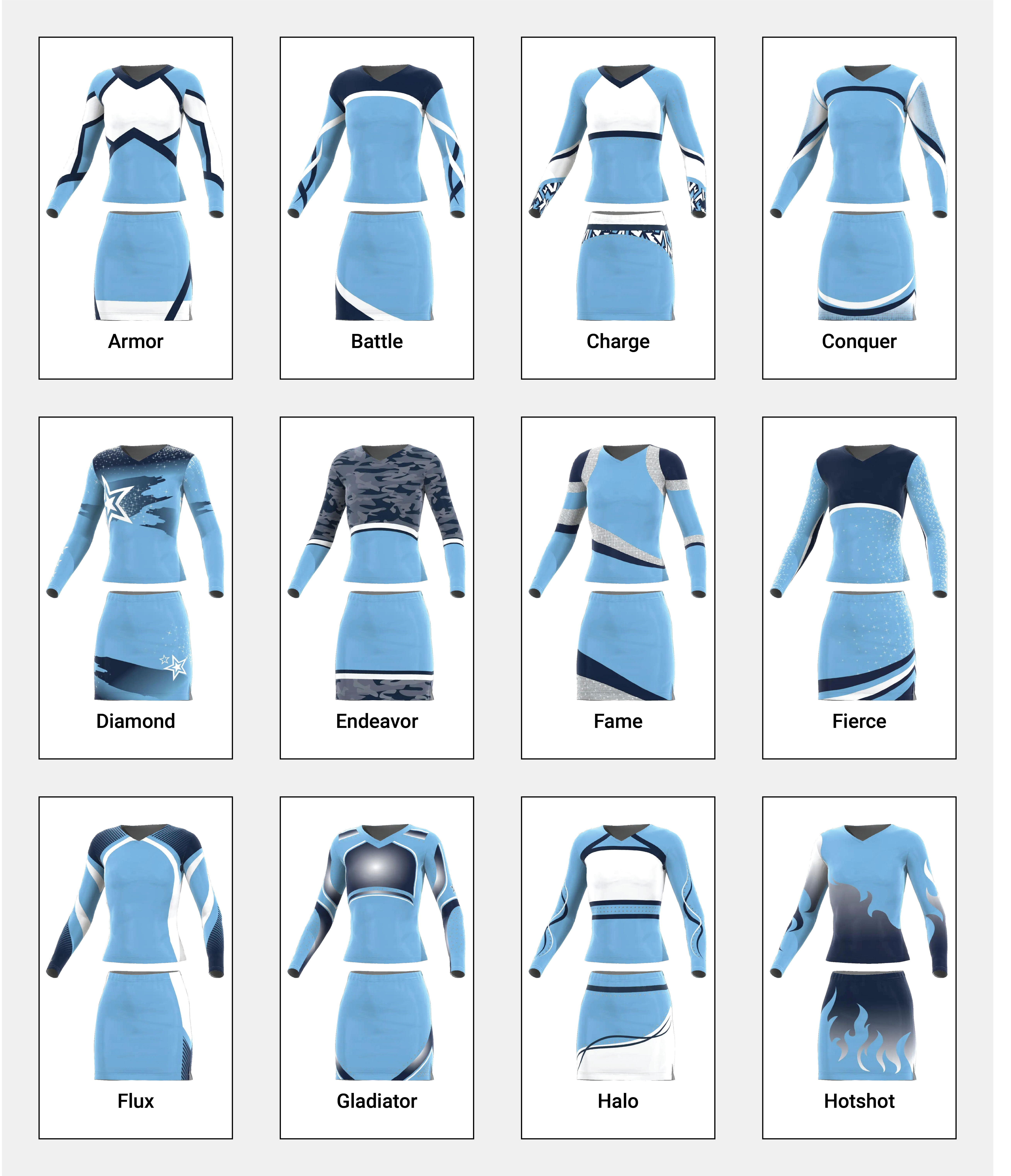 Use our online design studio to start creating your team?s new custom cheer uniforms now! Select the uniform style that fits your team vision, choose from multiple designs available for that style, pick your team colors, and add your team logo or mascot! It?s easy and fun!