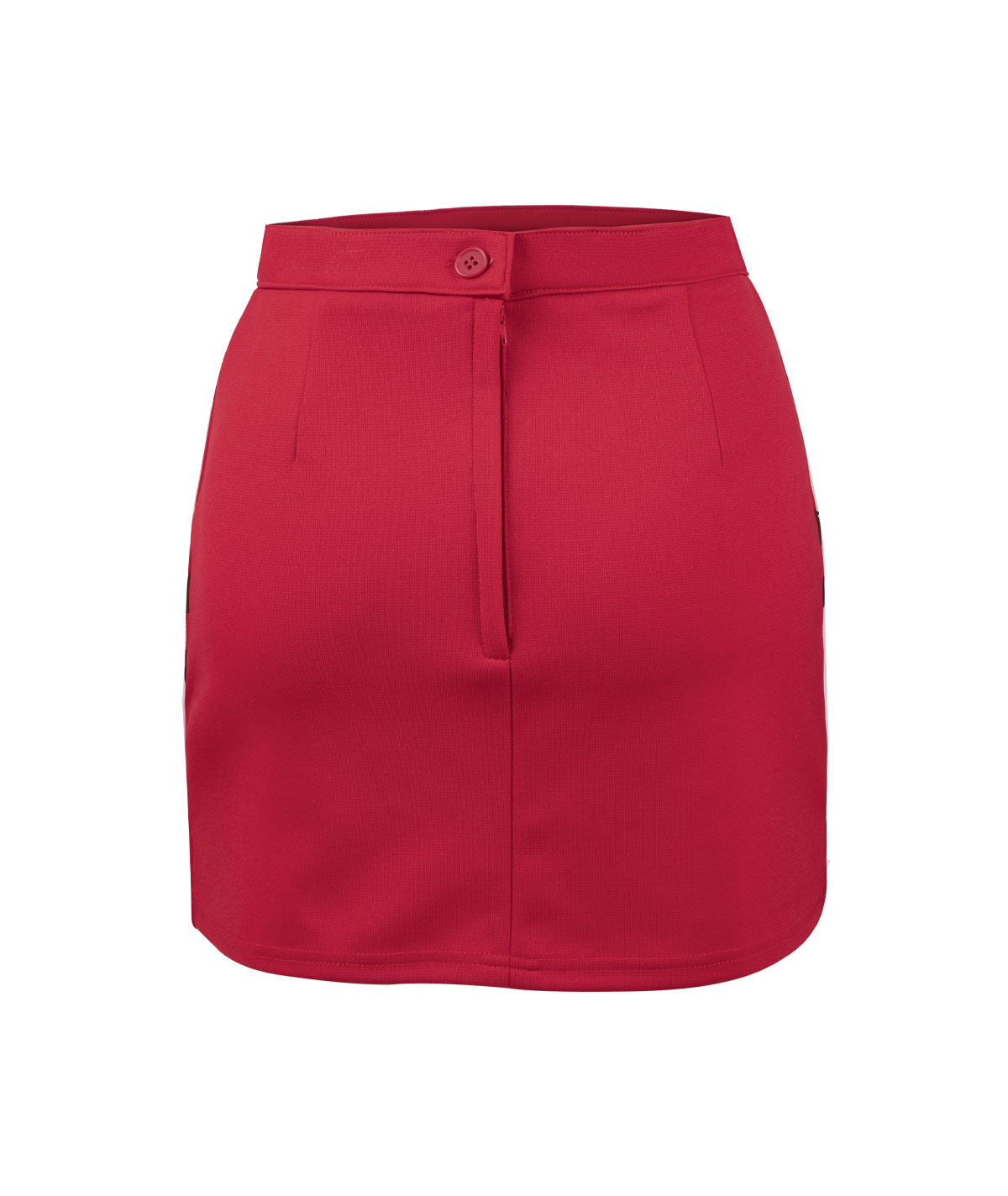 The Chasse Contender Uniform Skirt (Item 718SKB) is an edgy addition to any sideline team! This three-color 100% double knit polyester uniform skirt features a V-notch, contrast taping, back button, zipper, a straight bottom hem, and 2" side slits. The Contender Uniform Skirt matches the Chasse Contender Uniform Shell Top (Item 717PTB) and the Chasse Performance Contender Uniform Bodyliner (Item 719PBS). This modern skirt is available in a variety of sizes and team colors, so any team can get the Contender look!