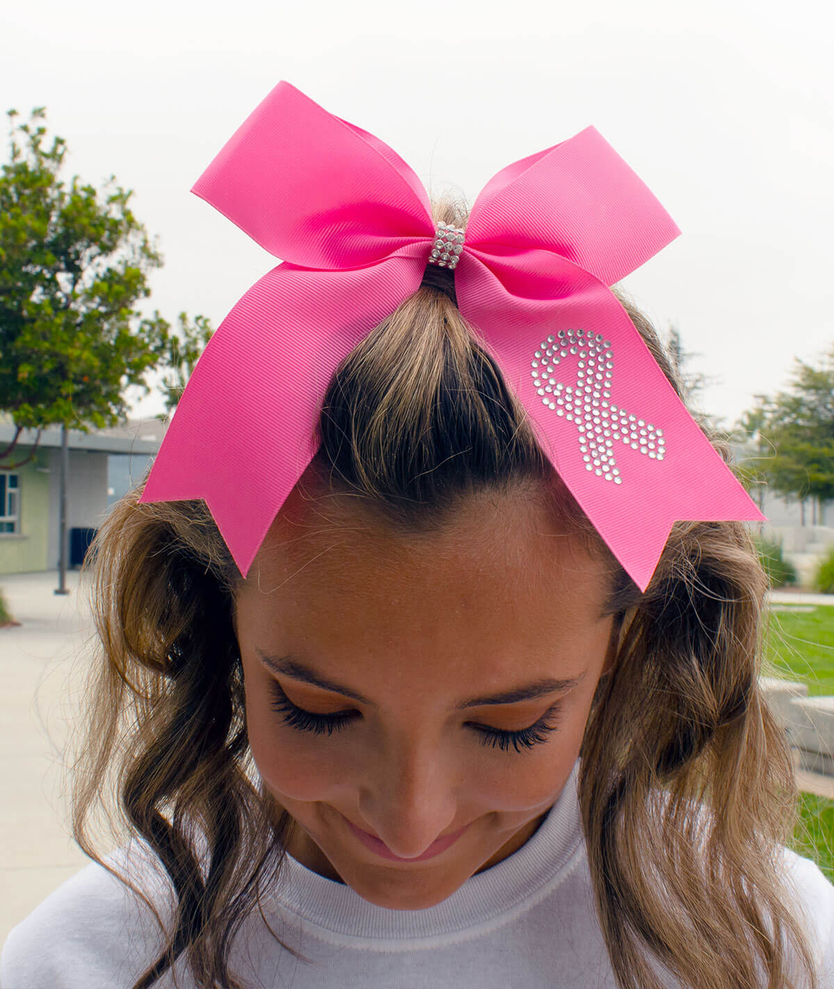 Raise awareness and show your team pink with the Chasse Pink Awareness Ribbon Hair Bow (AC2201). During October or any time of year, show your support for Breast Cancer Awareness with your teammates. This bright pink cheer bow features beautiful multi-color crystal awareness ribbon and center bow accents to add extra sparkle to your look.