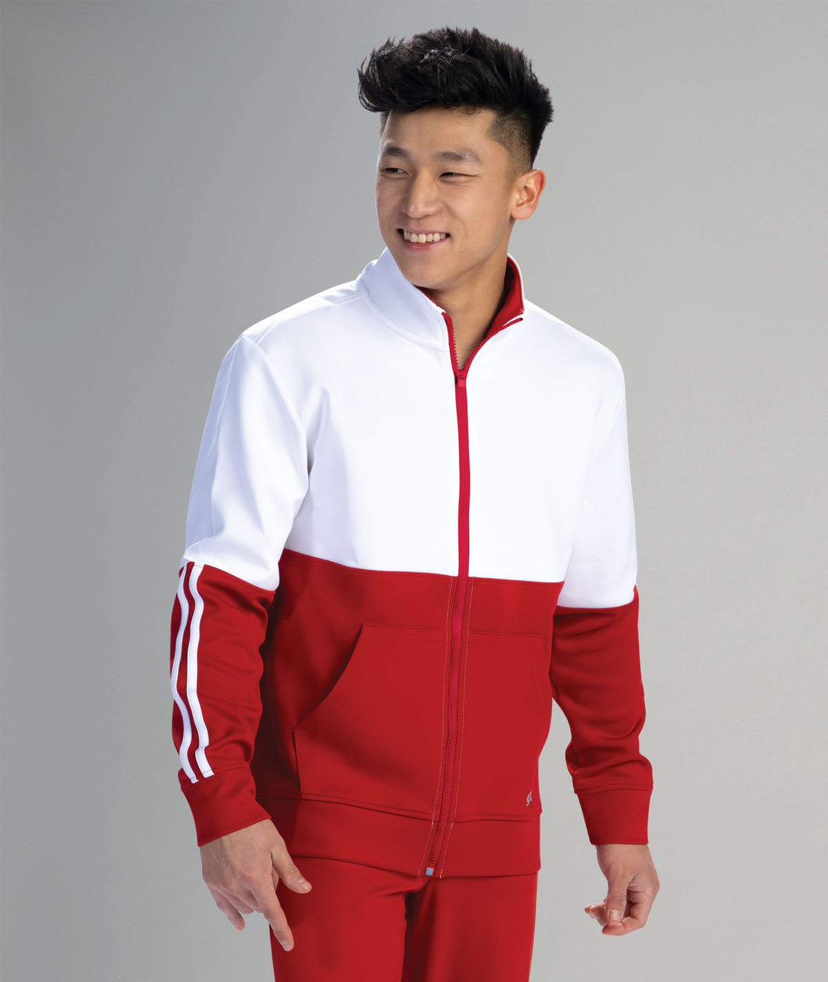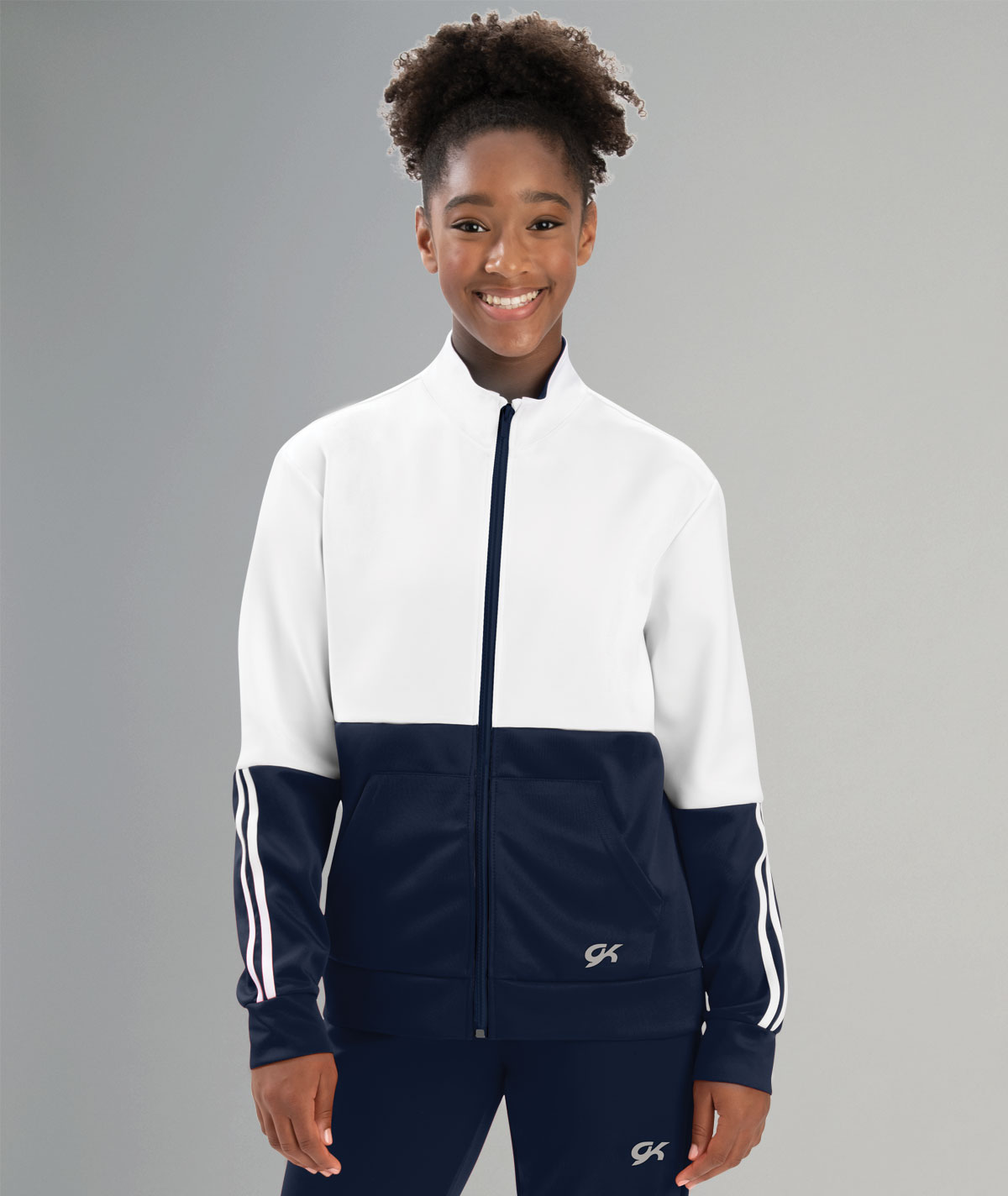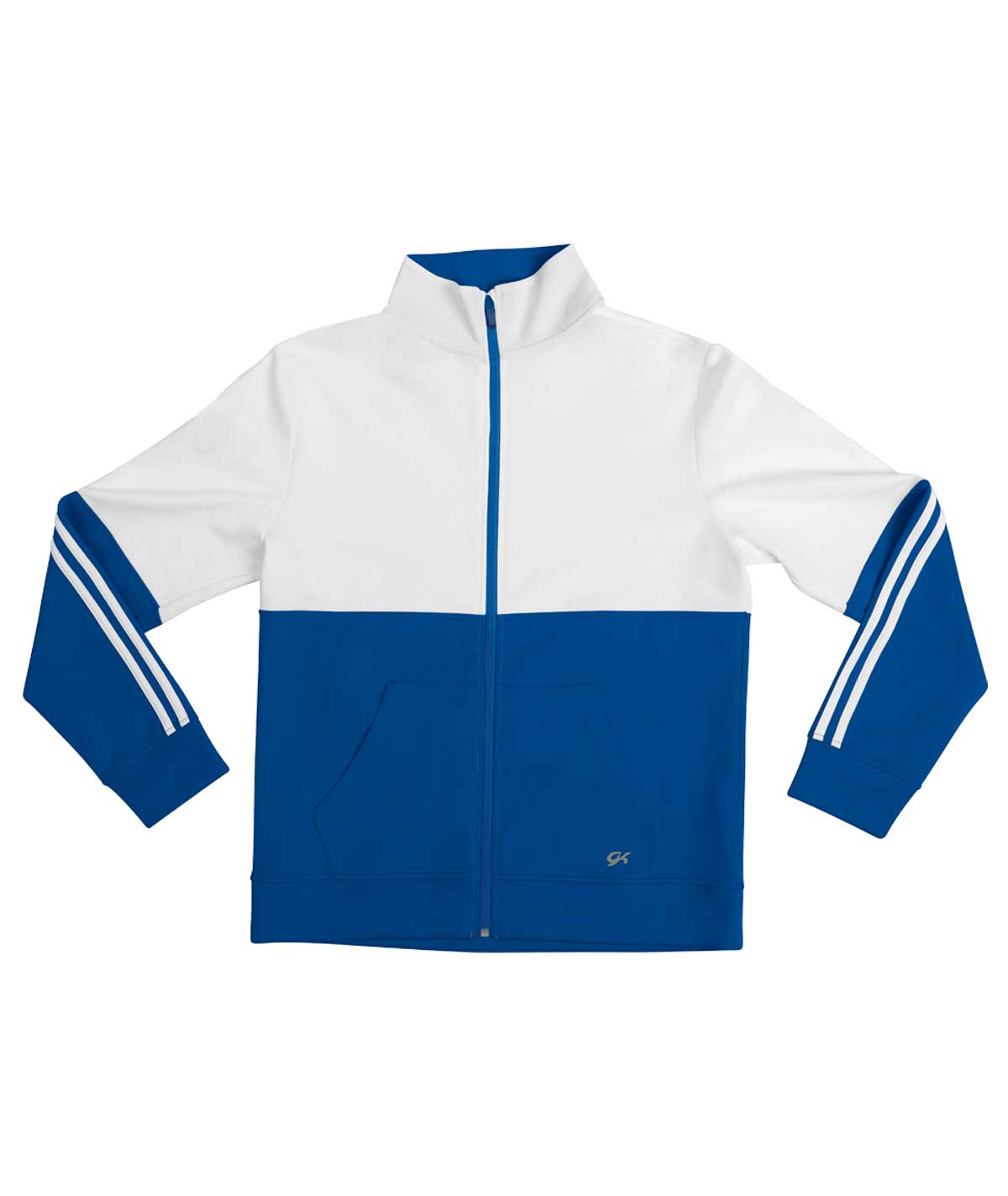 Stand out from the crowd with this sleek GK Unisex Color Block Jacket (WUJ03G) with full front zipper closure. A relaxed, slim-fit cut combines with a color block style and striped half-sleeve details, ensuring every member of your cheer team looks their best. Convenient unisex sizing. 95% Polyester and 5% Spandex.