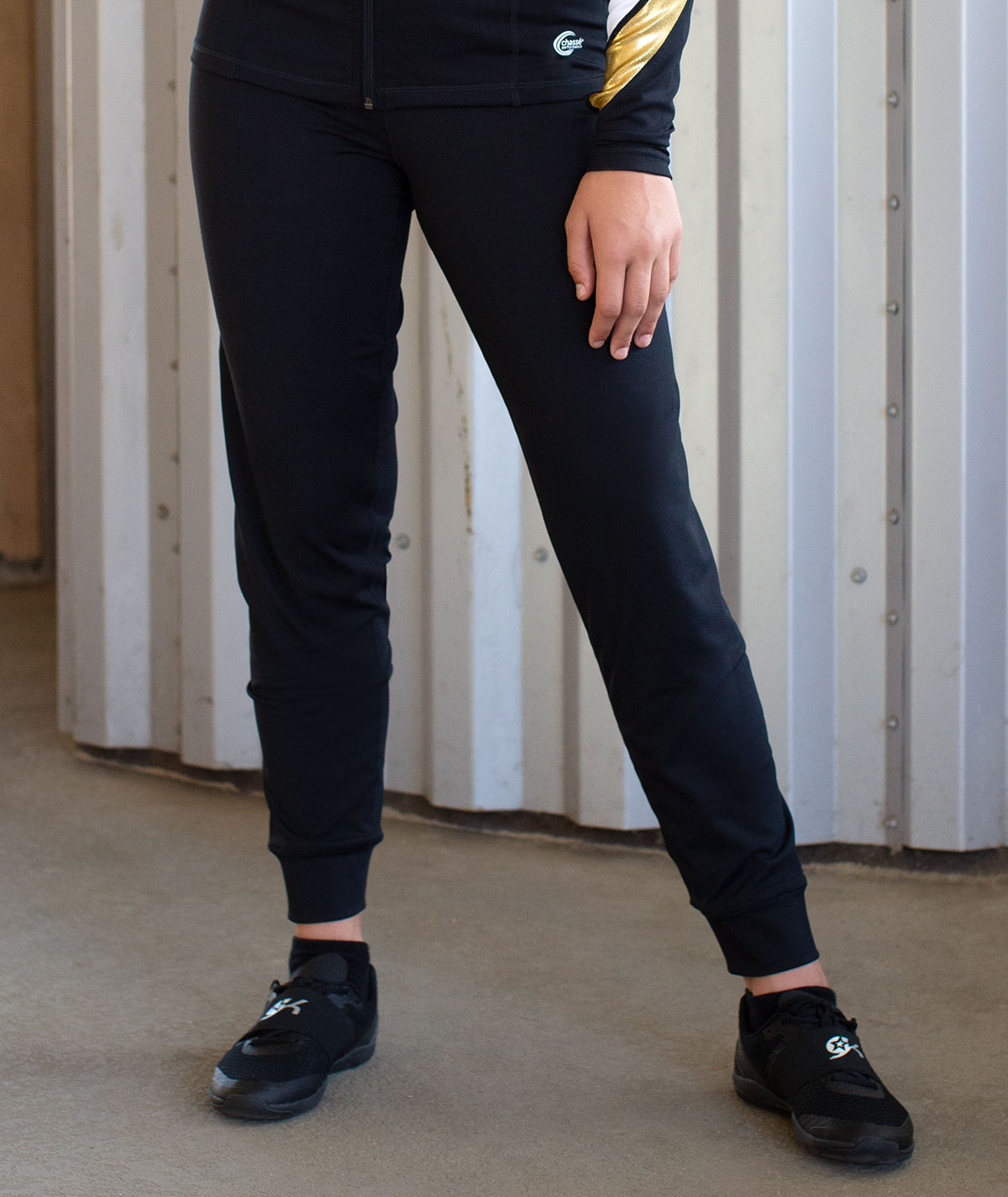 This jogger pant is made with a coverstitch detail and wide elastic waistband. This dynamic duo exudes confidence and grants VIP Status! Designed with functional features, this cheer pant will keep you warm and stylish during pre-game and warm-ups.